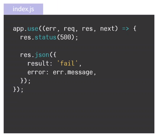 가장 아래 적용된 err, req, res, next를 이자로 갖는 함수가 오류처리 미들웨어