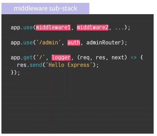 use나 http method함수에 여러 개의 미들웨어를 동시에 적용할 수 있음.